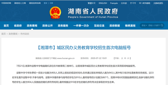 湘潭市教育局负责人介绍,城区民办义务教育学校实行电脑随机派位,具有历史性的意义,是湘潭市公办民办义务教育学校同步招生、彰显教育公平公正公开、努力办人民满意的教育的一项重要举措。电脑随机派位未派中的城区学生,纳入公办义务教育学校的第二批录取程序。7月22日至23日,在市教育局和区教育局网上报名平台申请补录。