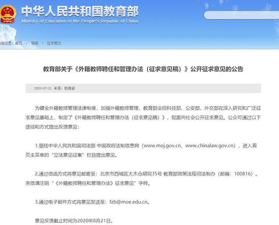 为健全外籍教师管理法律制度,加强外籍教师管理,7月21日,教育部官网发布关于《外籍教师聘任和管理办法(征求意见稿)》(以下简称《办法》),面向社会公开征求意见。