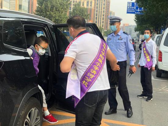 早上7时20分,正是小学送学高峰期,清华附小清河分校西门外,送娃的车一辆辆驶来。与常见的送学场景不同,这些车只在校门前停留几秒钟,家长不需要下车,开关车门、守护孩子入校的,是戴着紫色绶带的家长志愿者和身穿蓝色制服的交警。