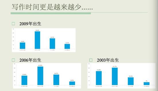 与此同时,受访者每周的写作时间也不乐观。《报告》指出,约24.4%受访者每周花在写作上的时间不足0.5小时,42.1%受访者每周花在写作上的时间处于0.5—1小时(不包括1小时)之间。在10岁、13岁、16岁的受访者中,每周花在写作上的时间不足1小时的学生分别占比约60.7%、66.4%、74.7%。