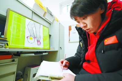 当天上课的是景山学校三年级的学生,在此之前,没有在课堂上接触过足球。“这些孩子都是零基础,我要在课刚开始的5分钟时间内连画带讲快速完成知识要领的讲解。画画是孩子们都能接受的一种表现形式,粉笔画又有快速达到效果的特点。在上课开始,用粉笔画的形式吸引孩子的注意力,他们会随着画的完成,完成思维形成。以前是用绘制好的图片,孩子们基本没什么印象,现在不一样了。”