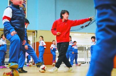 上周三下午,一堂由粉笔画引领的小学足球体育课在景山学校举行,授课老师是东城区新鲜胡同小学体育老师肖晶。她上课的主题是“小足球脚内侧踢球游戏”,而引入粉笔画来突破体育课教学难点,还是一个全新的尝试。