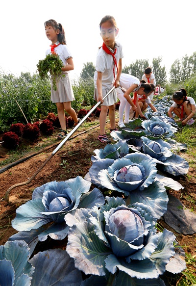 2019年6月20日早晨,山东青岛市蓝谷高新区东皋埠小学学生在“校园农场”里进行田间管理。梁孝鹏/摄(新华社发)(资料图片)