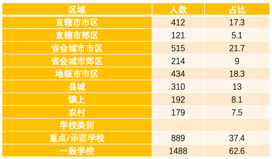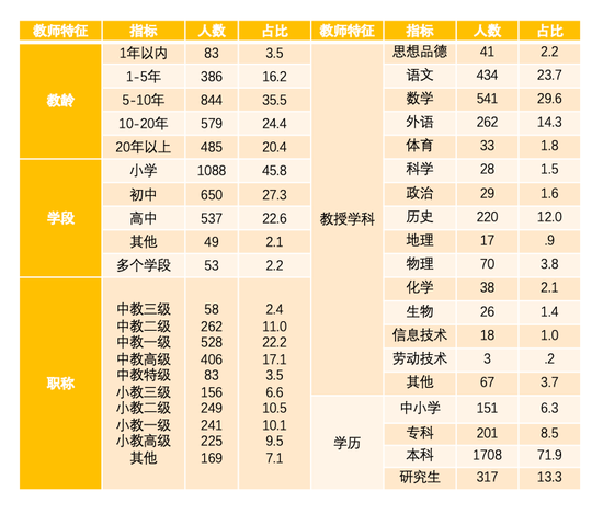 调查首先按省份配比样本,然后通过极数云平台采集数据。剔除无效样本后,得到2377份合格样本。具体样本的地区分布、教师特征分布如下,由于职高与中职教师样本较少,后面分析中就不再对这两类数据进行统计,教授学科去除了兼授学科数据。各省份和学校分布情况见附录。