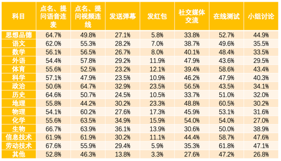各项互动方法的百分比如表3,在线测试互动使用最多的是劳动技术,地理和体育课紧随其后,发送弹幕最多次数的是生物课,发红包和在线交流最多次数的都是政治课。