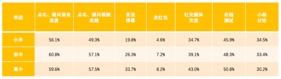 各学段具体在使用七项互动方法的百分比如下图,除了最常见的三种互动方式(语音连麦、视频连线、在线测试)以外,高中教师还喜欢通过发弹幕、社交媒体交流等方式互动。